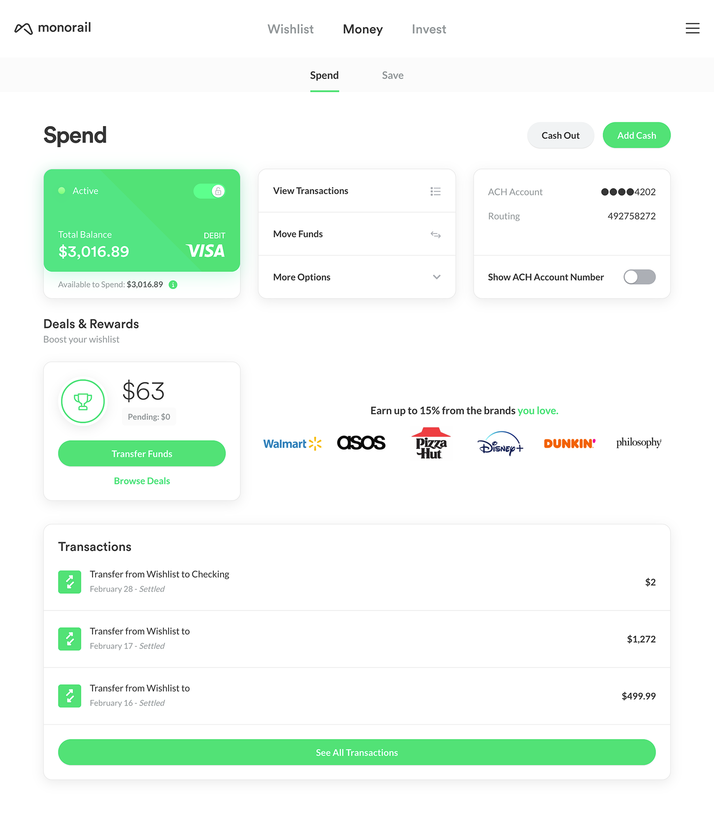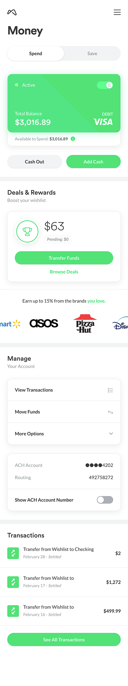 Access to your checking account, debit card management, cashback rewards and you saving goals.